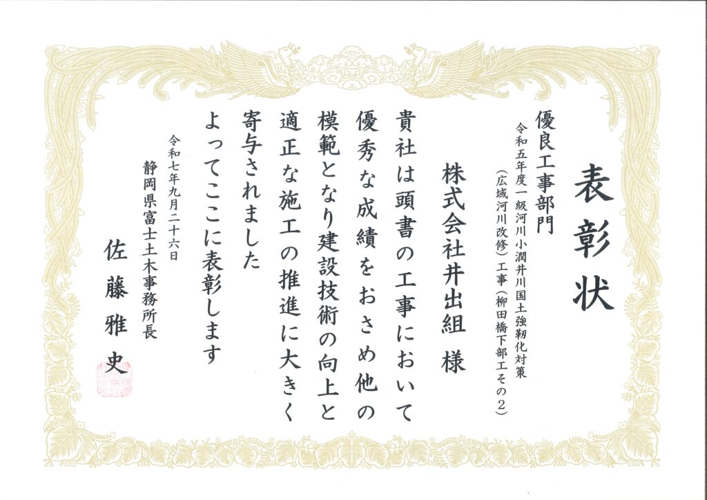 この度、静岡県富士土木事務所発注の「令和5年度一級河川小潤井川国土強靭化対策(広域河川改修)工事(柳田橋下部工その2)」において、優良工事表彰を受賞しました。
